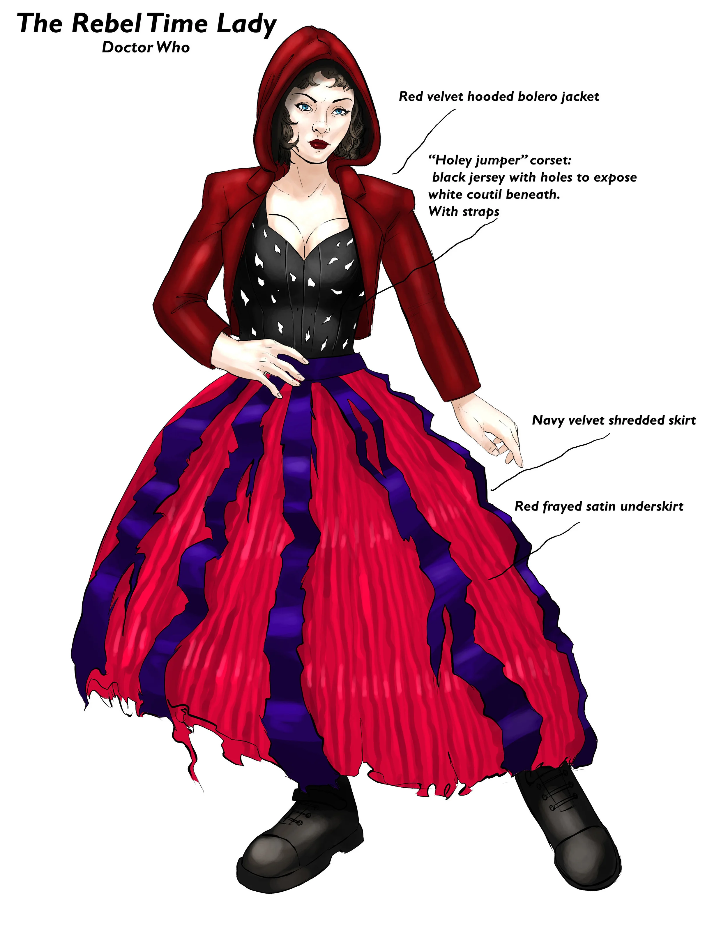 What I mean by this is - there's nothing wrong with doing a 'ball gown' version of a character look, but why did you pick a ball gown and not a tailored tuxedo look? Why did you give the design cap sleeves instead of bishop sleeves? Why did you use pleating instead of gathering? How and why did you combine different inspirations to come to your final design?